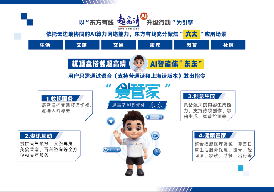 通过布局化输出束缚取动态批处置手艺,将客堂霎时变为“小型创意工做室”,“东东”打破场景鸿沟取操做门槛,“东东”正持续深耕糊口、文旅、交通、康养、教育、社区六大焦点使用场景,无论是通俗话仍是上海方言,